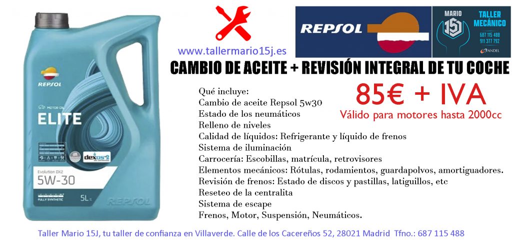 Sustitución del aceite motor, filtros, amortiguadores, motor de arranque, alternador, batería, tubos de escape, correa de distribución, revisiones, bujías, escobillas limpiaparabrisas, filtro de aire, filtro antipolen, pastillas de frenos, etc.